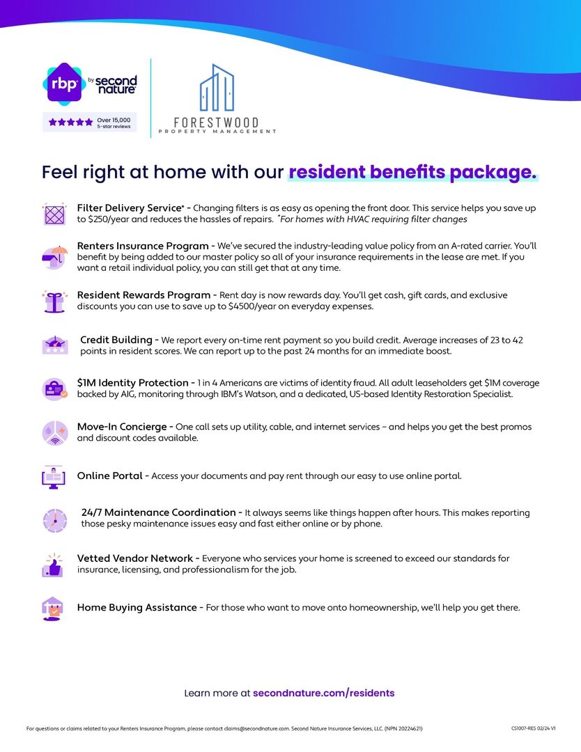 All residents are enrolled in the Resident Benefits Package (RBP) for $47.00/month which includes liability insurance, credit building to help boost the resident’s credit score with timely rent payments, up to $1M Identity Theft Protection, HVAC air filter delivery (for applicable properties), move-in concierge service making utility connection and home service setup a breeze during your move-in, our best-in-class resident rewards program, on-demand pest control, and much more! More details upon application.